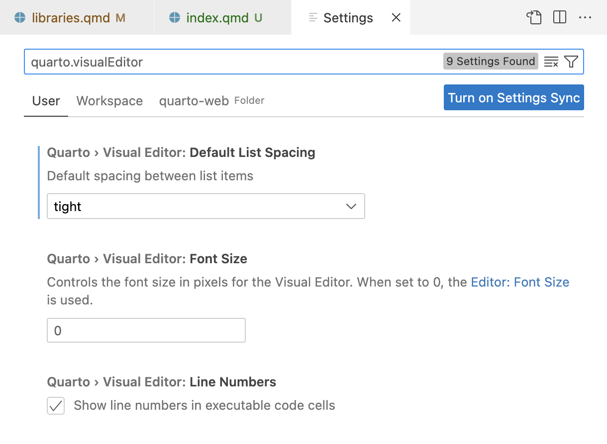 quarto.visualEditor.markdown).Specifying them within document or project level YAML (described below).