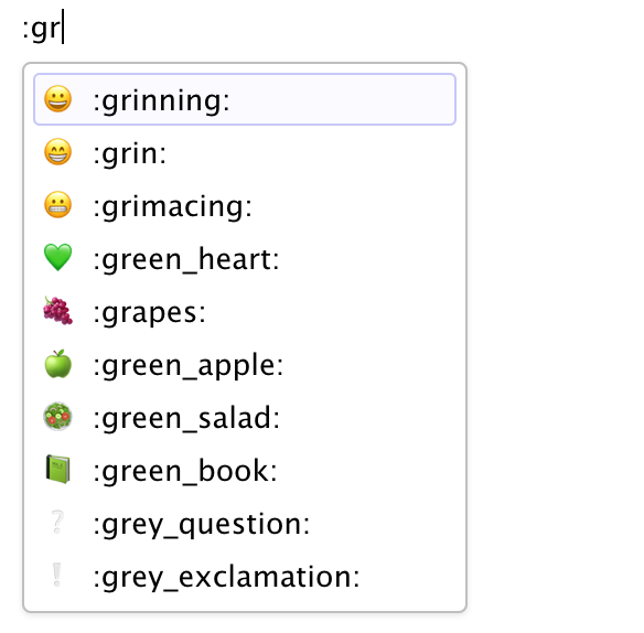 To insert an emoji, you can use either the Insert menu or the requisite markdown shortcut plus auto-complete: